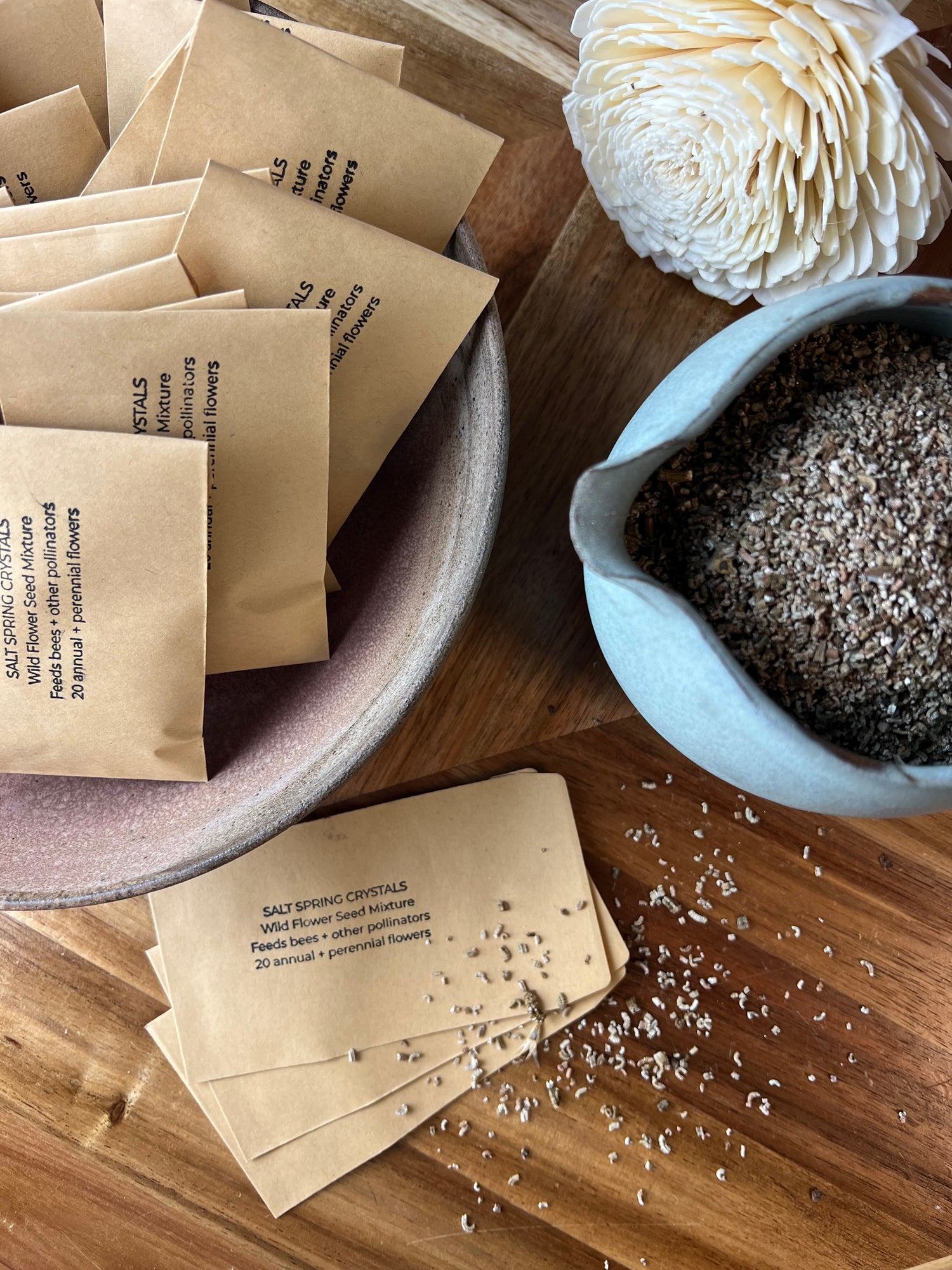 While quantities last - each order will come with a package of wildflower seeds filled with a mixture of over twenty different annual and perennials to feed bees and other pollinators.